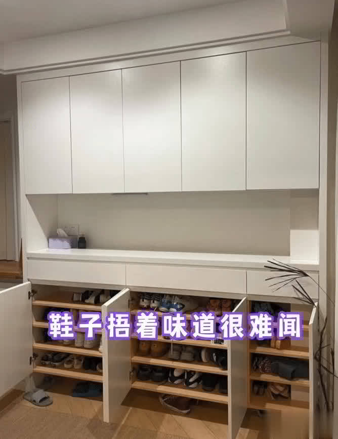 1、鞋柜底部没有留空20公分,鞋子在门口摆的乱糟糟的。鞋柜没预留透气孔,打开柜门,味道很难闻。